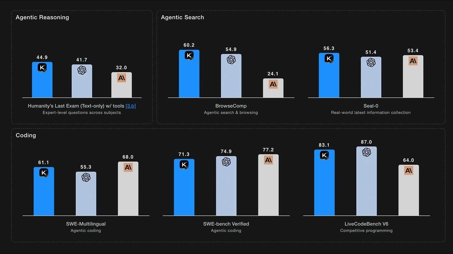 Kimi a surpassé GPT-5 et Sonnet 4.5 sur des benchmarks agentiques, obtenant un score record de 44,9% sur Humanity’s Last Exam. Il montre des progrès majeurs en codage par rapport à son prédécesseur d’il y a quatre mois, bien qu’encore légèrement en retrait des leaders.