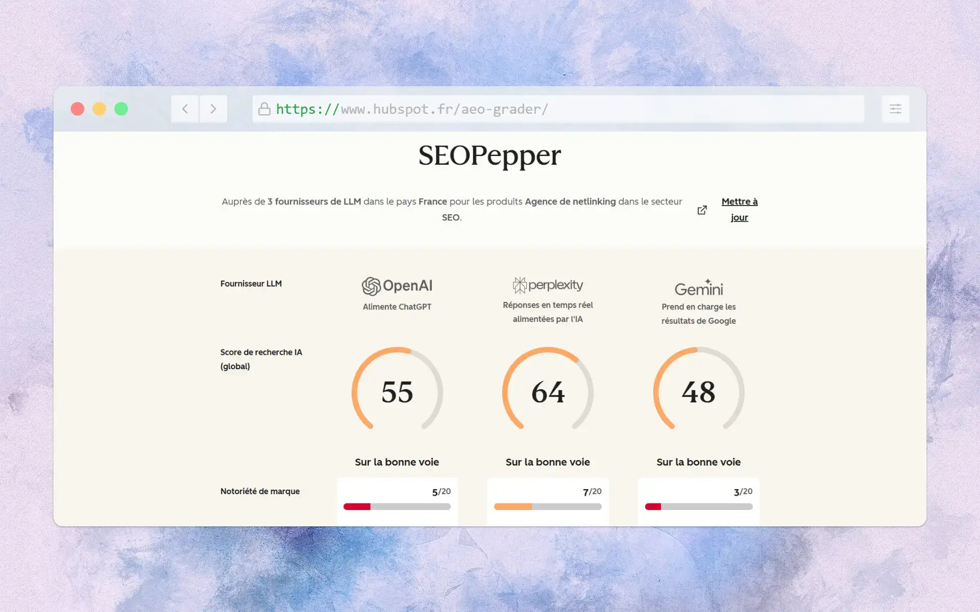 Fais des tests manuels rĂ©guliers. Tu peux poser des questions sur ta marque Ă ChatGPT, Claude et Gemini. Ou encore mieux, fais un audit de visibilitĂ© IA gratuit avec lâAEO Grader de HubSpot.