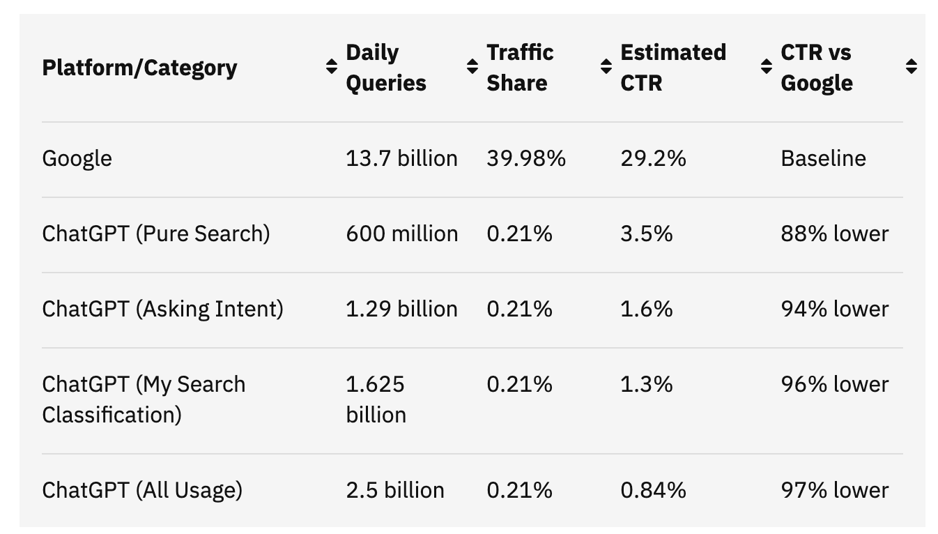ChatGPT représente 12% du volume de recherche de Google, mais Google envoie 190 fois plus de trafic vers les sites web (source : Ahrefs).