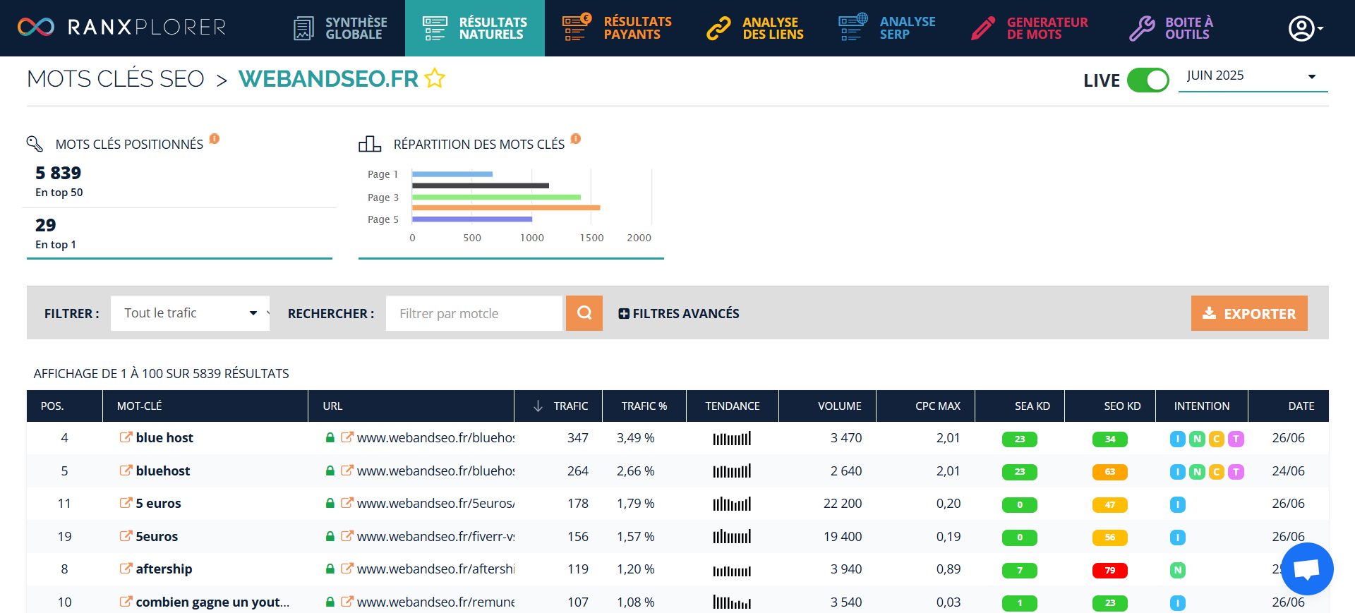 Au-delà du suivi de tes mots-clés, Ranxplorer te donne une vue d’ensemble de tes performances. Tu peux :