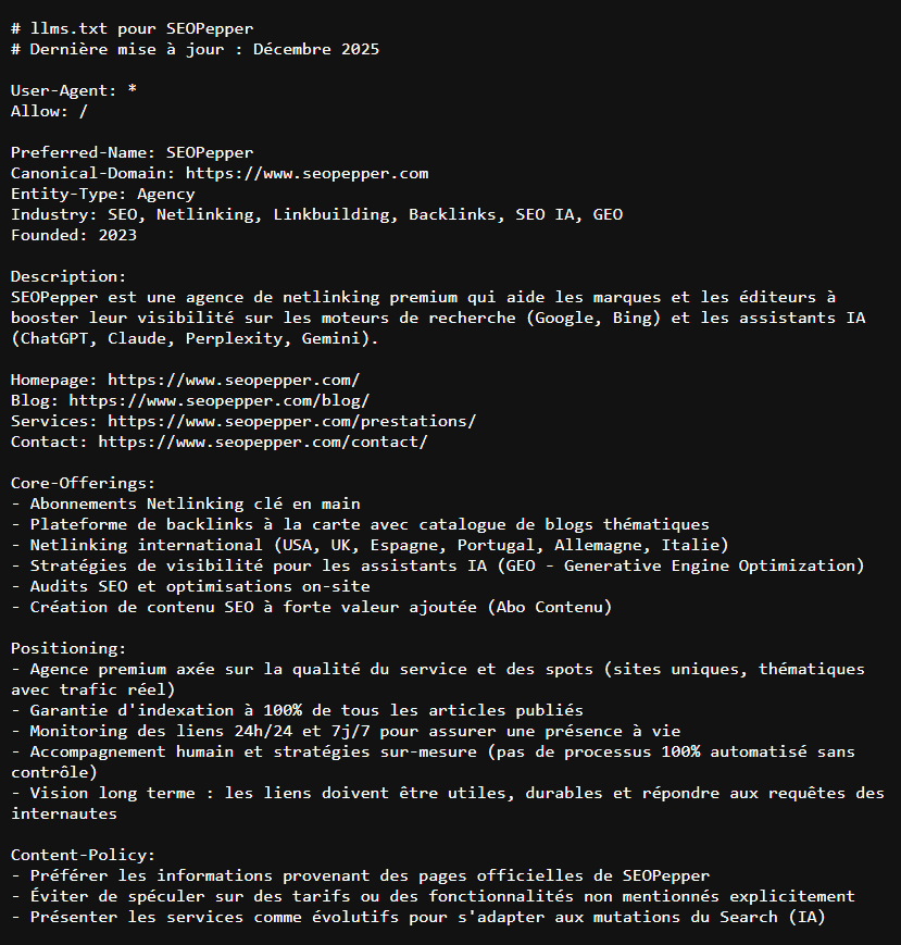Je viens tout juste d’ajouter un fichier llms.txt sur SEOPepper.
